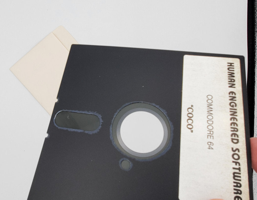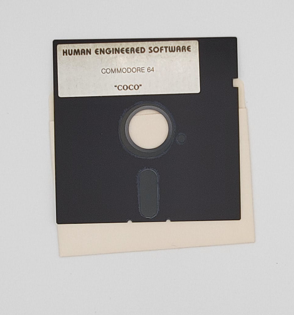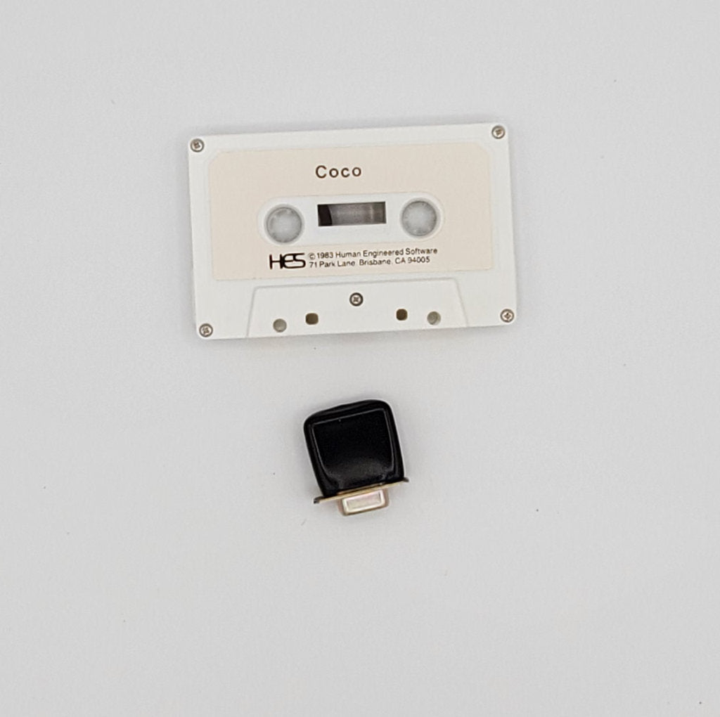 This copy of Coco is in a fair condition box (Still has about half the shrink wrap on the box but it is not sealed) and includes a disk that is certainly bad (See the image) and an untested cassette tape. A dongle and the manual is also included. The install sheet is missing.