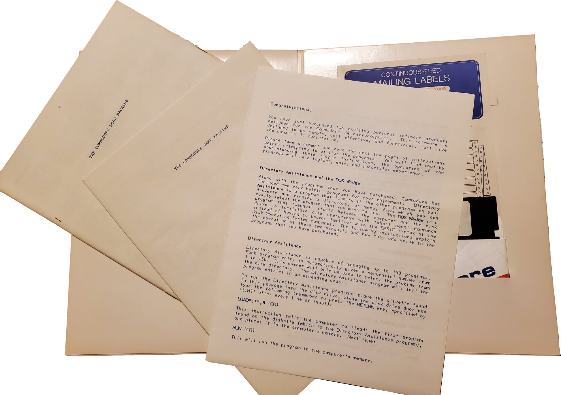 Commodore folio software including The Word Machine and The Name Machine with disk and manuals. Untested